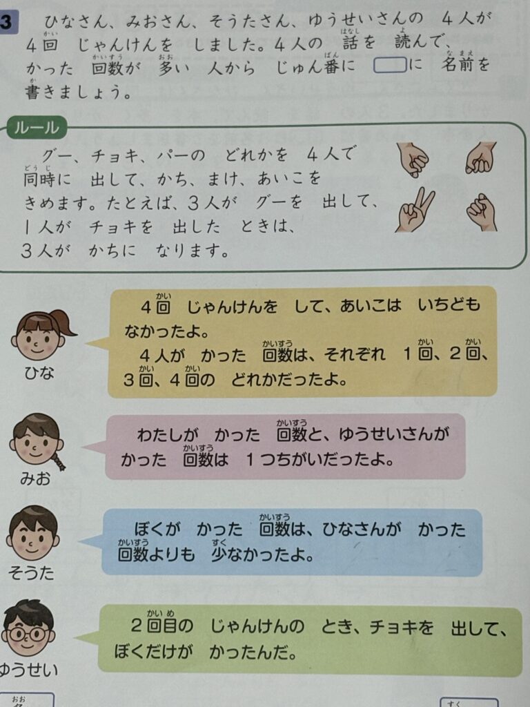 例えば、以下のような問題(家庭でやっている通信教材)は以前はとても苦手で、親が一緒にやらないといけなかったのですが、プログラミングを始めてから一人でも順序立ててできることが多くなってきたような気がします。