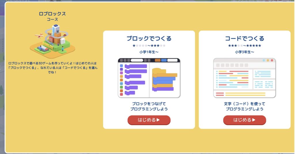 将来的に自作ゲームをロブロックス上で作り込みたい場合は、いずれコードが必要になります。最初は簡単なミッションから始まりますので、タイピングの習熟とともに、段階的に移行できるカリキュラムです。