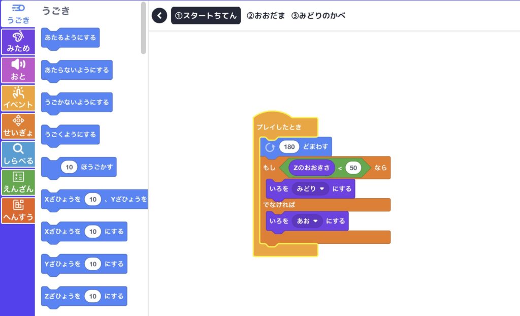 - ブロックでつくる(初心者向け):ビジュアルプログラミング。ブロック操作をすることでタイピングいらずで簡単に操作ができます。