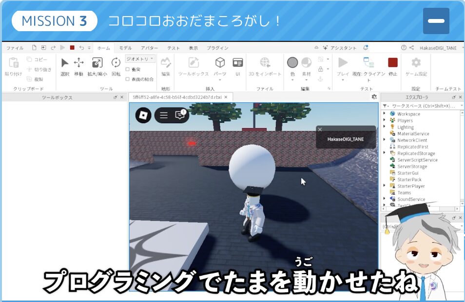 ロブロックスコースのミッションの内容は、ゲームの仕掛け作りの部分。ブロックを配置したり、ゲーム内の世界観を考えたりといった「ゲーム作り」はミッション内では扱いません。